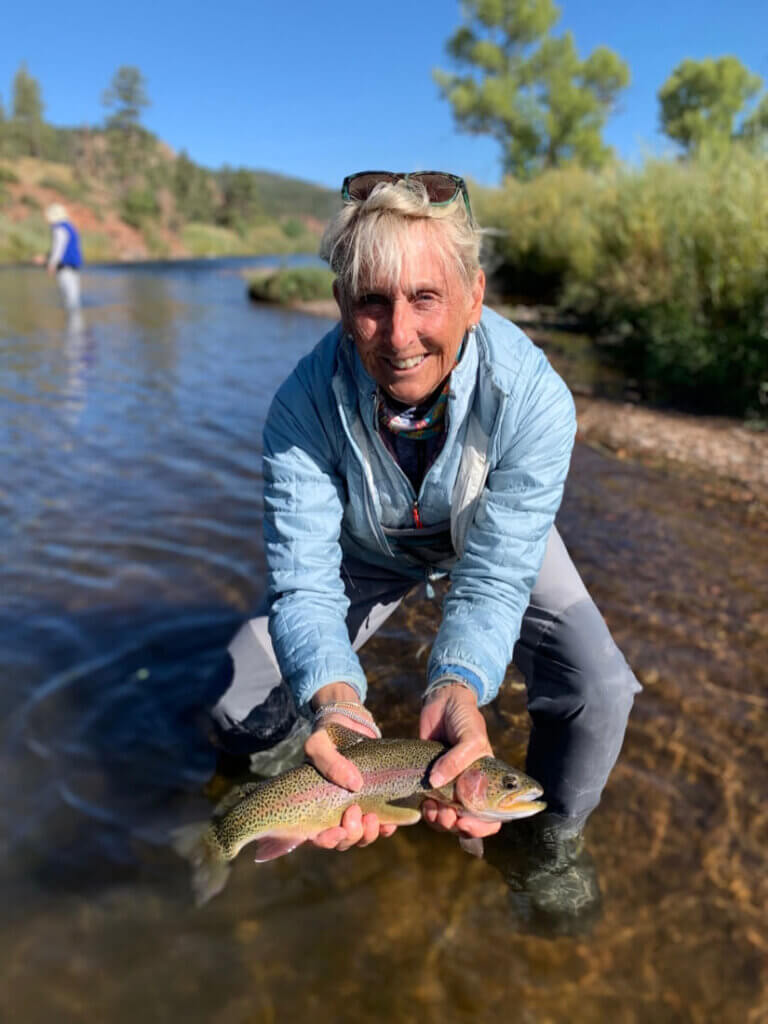 But new hatches were occurring, and we had to stay ahead of the fish. Kenny switched my wet fly to the caddis dry fly and thankfully took over my rod. And bingo–a strike! I found my rod back in my hands as I reeled in my prize—a beautiful rainbow trout. I was immediately surrounded by my personal river paparazzi (husband and guide), who ensured we had the proper poses for photos. And then I reluctantly released my first catch into the stream.