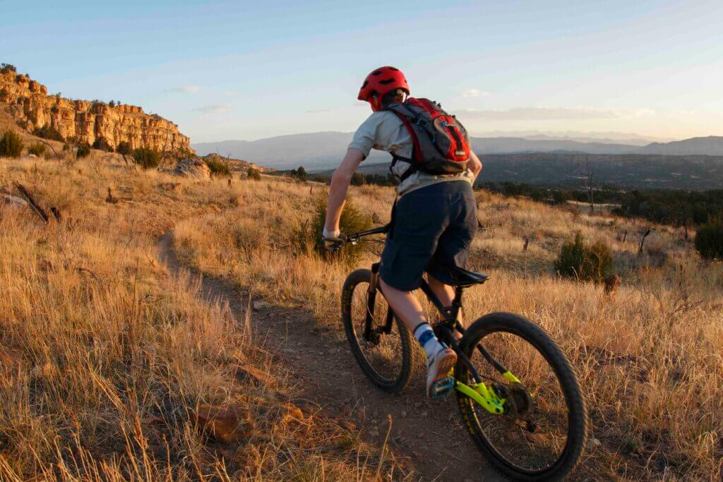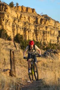 Fast forward to a late summer evening in 2020. Owen and I headed just north of town to ride the conglomerate of trails at Oil Well Flats, named for the defunct nearby oil well that once was the nation’s second-oldest commercial well. This network of magnificent singletrack– ranging from easy to difficult – wind through pinion, grass, cactus, and a wild world of brightly colored Jurassic geology where famous and historically significant dinosaur fossils have literally been found underfoot.